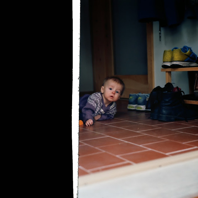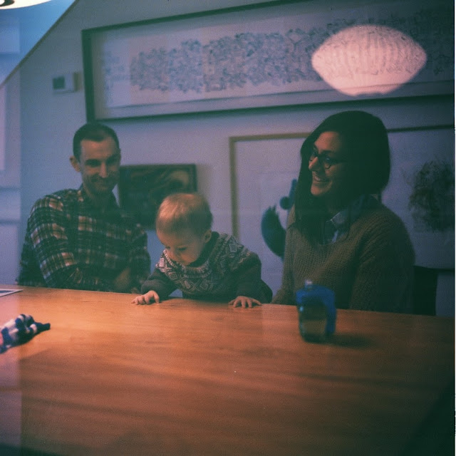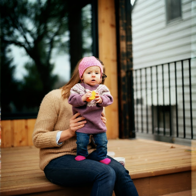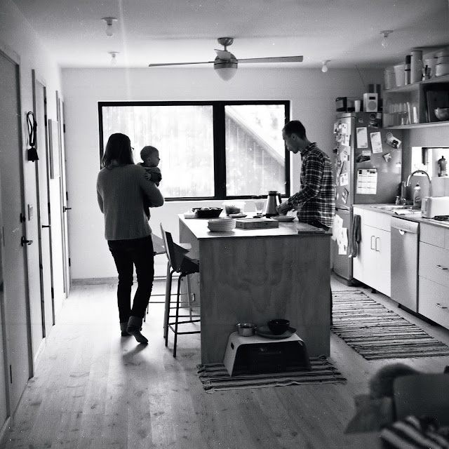 Nils, Melissa, wee Marte and Poncho the poodle invited me into their striking Winnipeg home a few weeks back. These are some of the color and contrast photos I felt free to capture while watching them move around their space as a family. Marte is nine months old and sweet as pie! To closely witness families go about their normal swing of things through my scope is something I delight in. I hope to do more of this type of work in the future. It is a damn treat to be invited in for a slow morning of quality coffee and play, free to raise the Kiev to capture when the spirit leads. I prefer the contrast work here, though the color definitely holds its own. I mean come on, that family photo with Poncho and his paw! Much too much for the quiet spectator in me. While the photo of new mama Melissa holding Marte on the kitchen counter is a little unconventional, I love the offbeat beauty of the scene. Two girls in the kitchen. One makes a point while the other makes the discovery she can handle the weight of an orange with her own two hands. The wonder of it all! The shot of the three Viks on the loose in the kitchen is very dear to me. Nils and his cheek stuffed with toast. This is life as we know it. I stuff toast in my cheek too.