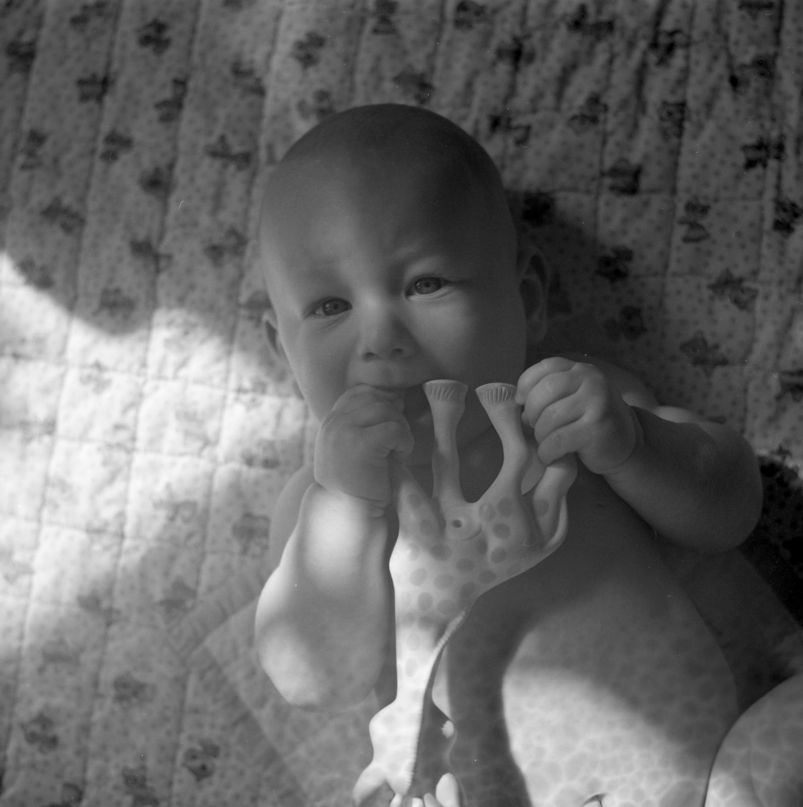 | Six months old and experiencing a great love affair with Sophie the giraffe. |